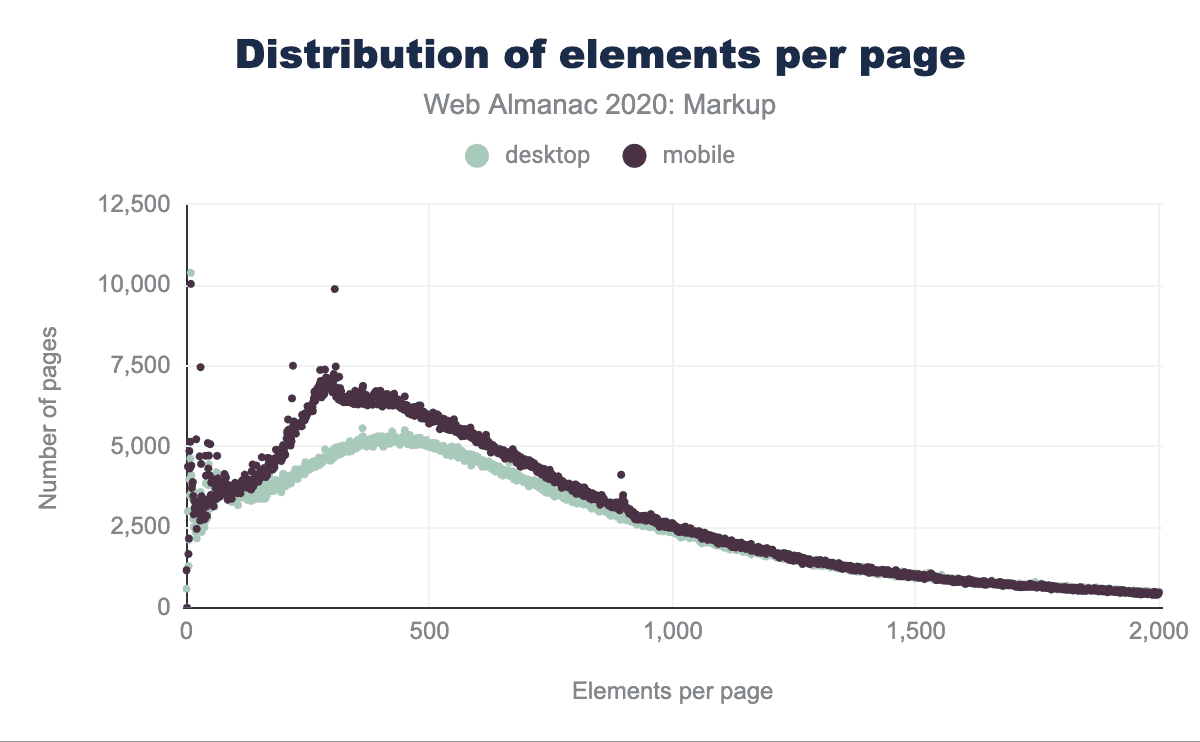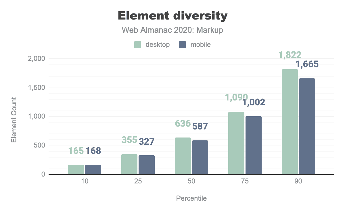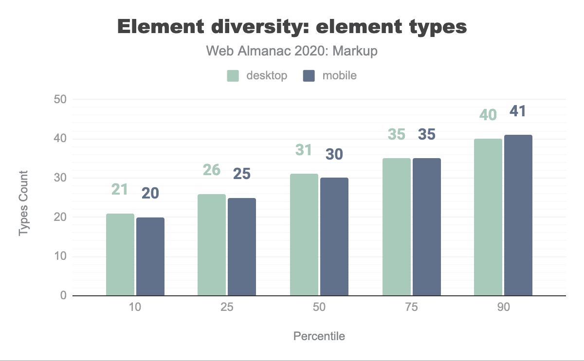 ウェブページの中央値では、30種類の要素が587回使用されていることがわかります。