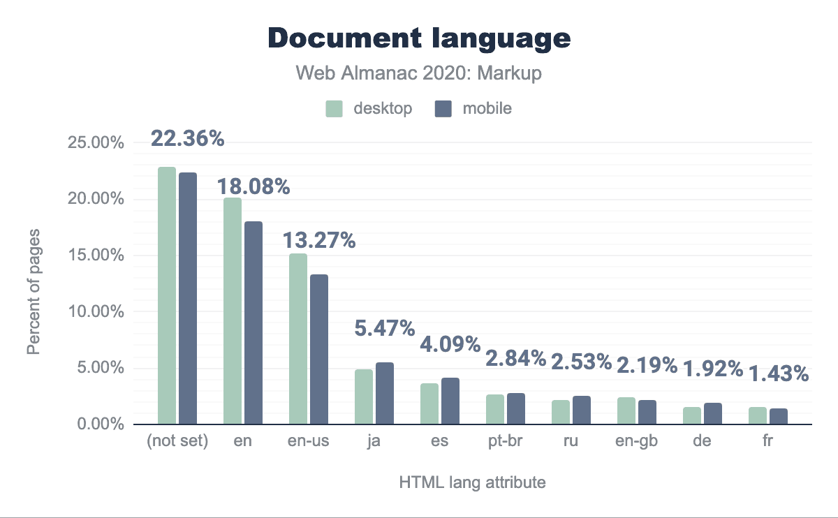 lang属性のトップ10を示す棒グラフ、デスクトップページの22.82%、モバイルページの22.36%が属性を設定しておらず、enはそれぞれ20.09%、18.08%、jaは15.17%、13.27%で使用されています。 また、esは4.86%、4.09%、pt-brは2.65%、2.84%、ruは2.21%、2.53%、en-gbは2.35%、2.19%、deは1.50%、1.92%、最後にfrは1.55%、1.43%で使用されていました。lang属性です。
