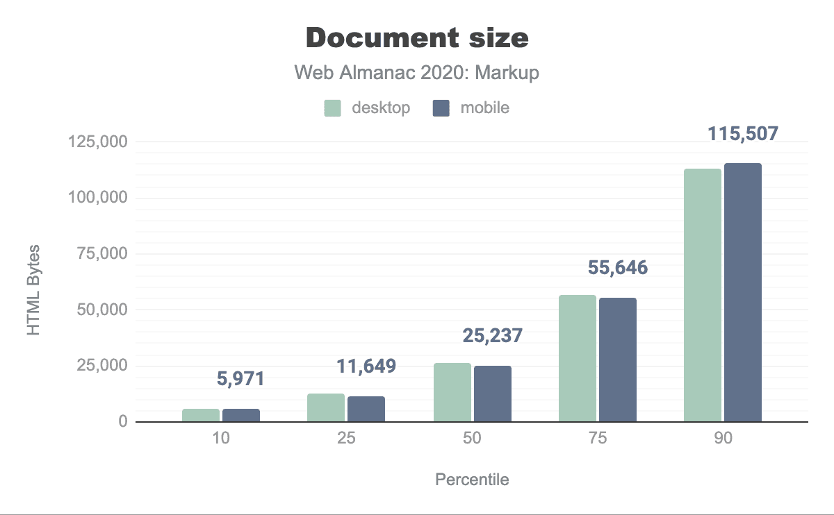多くのページでは制作のためにコメントが削除されているでしょうが90パーセンタイルのホームページでは、モバイルでは約73個、デスクトップでは約79個のコメントが使用されており、10パーセンタイルでは約2個のコメントが使用されていることがわかりました。 中央値のページでは、16個(モバイル)または17個(デスクトップ)のコメントが使用されています。