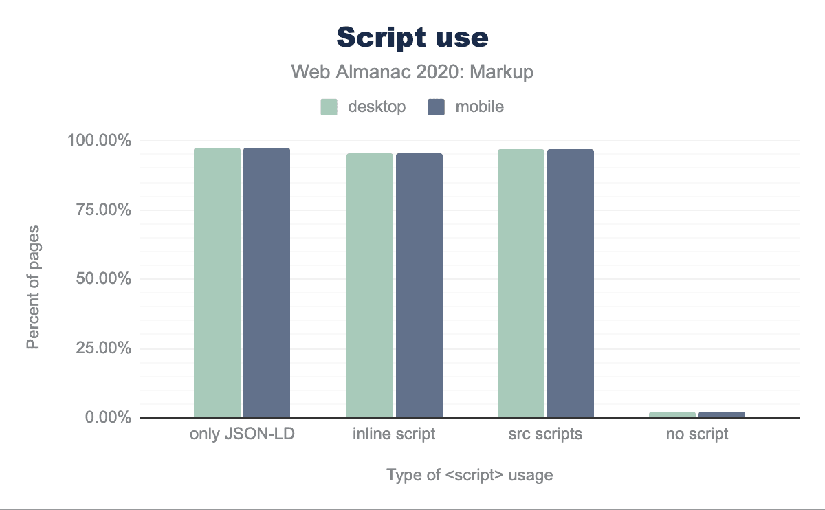 全体では、約2%のページにスクリプトがまったく含まれておらず、type="application/ld+json"属性を持つ構造化データスクリプトも含まれていません。最近では、1つのページに少なくとも1つの分析ソリューション用のスクリプトが含まれていることがかなり一般的になっていることを考えると、これは注目すべきことだと思います。