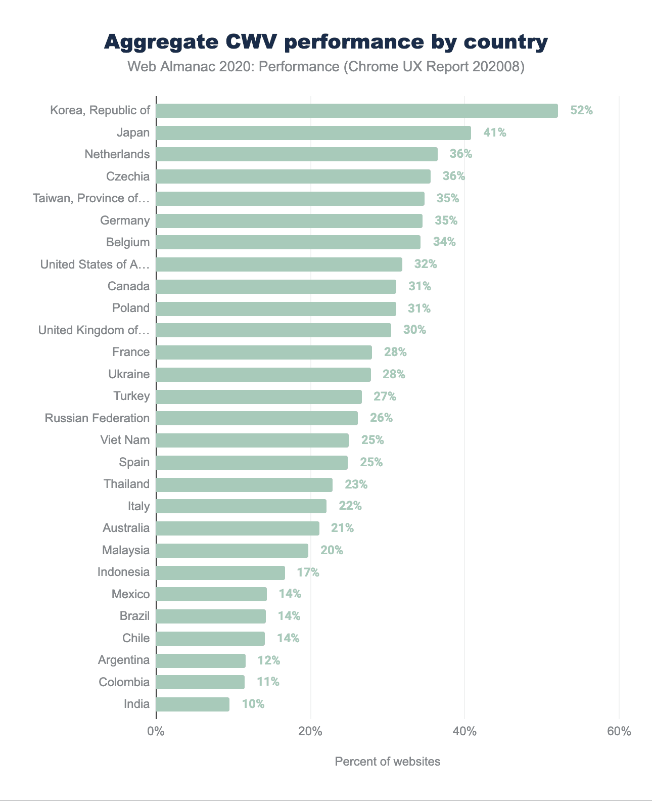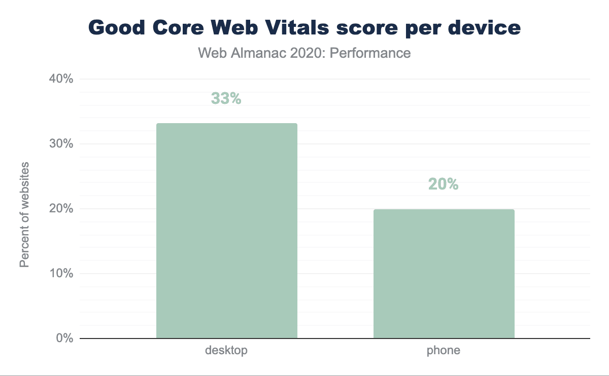 - ウェブサイトの33.13%がデスクトップで Good Core Web Vitalsを獲得しましたが、モバイル版の19.96%のみがCore Web Vitalsの評価に合格しました。これは、デスクトップが引き続きユーザーにとってよりパフォーマンスの高いプラットフォームであることを示しています。