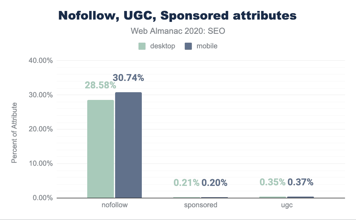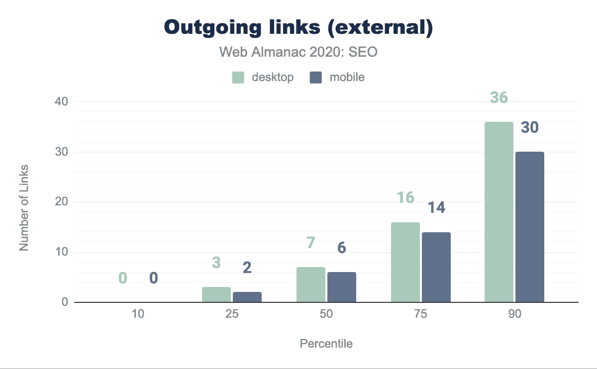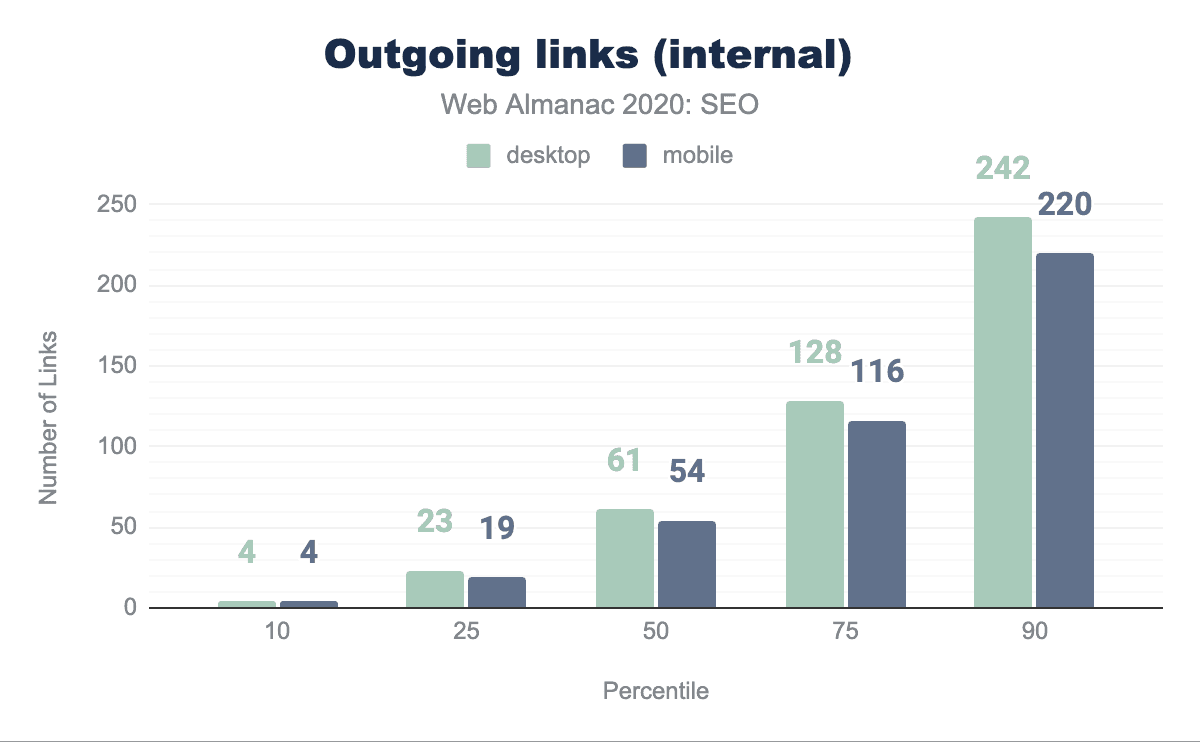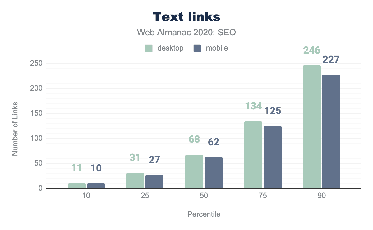 viewportタグをまったく含んでおらず、まだモバイルフレンドリーではないことを示唆しています。 - モバイルページとデスクトップページでは、些細な違いが見られました。たとえばモバイルとデスクトップのリンクの違いは、中央値のウェブページでモバイルのリンクが62であるのに対し、デスクトップのリンクが68であることで示されています。