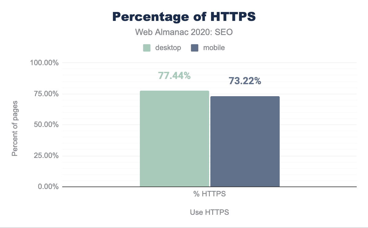 AggregateRatingはモバイルで23.9%、デスクトップでは23.7%上昇しています。 - HTTPSの使用: デスクトップページの77.44%、モバイルページの73.22%がHTTPSを採用している。これは、昨年より10.38%増加しています。