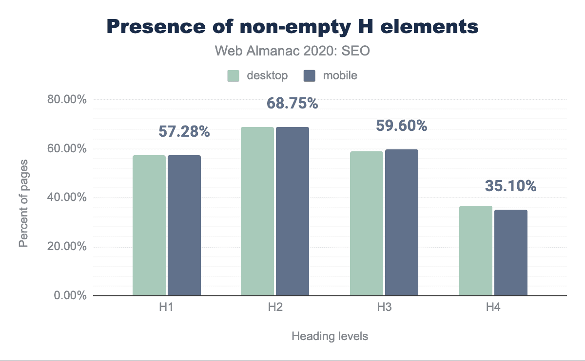 60%以上のページが、モバイルとデスクトップの両方でH1要素(空のものも含む)を使用しています。