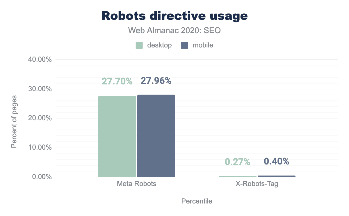 メタタグは、デスクトップの27.70%、モバイルの27.96%のページで使用されており、粒度の高い実行方法として圧倒的な支持を得ていました。X-Robots-Tagは、デスクトップで0.27%、モバイルでは0.40%でした。