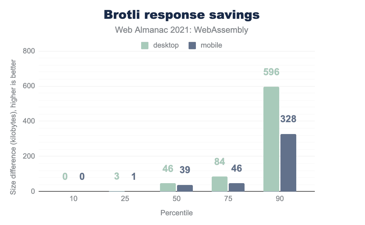 中央値は約40KBの節約となった。上位10%は、デスクトップで600KB弱、モバイルで330KBを節約しています。最大の削減量は、35MB/21MBに達します。これらの違いは、少なくともWebAssemblyコンテンツについては、可能な限りBrotli圧縮を有効にすることへ有利に働きます。