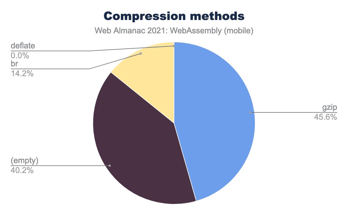 また、46%はgzipを使用しています。gzipは長い間、ウェブにおける事実上の標準的な方法であり、今でもきちんとした圧縮率を提供していますが、今日のベストアルゴリズムとは言えません。最後に、14% のみがBrotliを使用しています。この最新の圧縮形式はさらに優れた比率を提供し、 すべてのモダン ブラウザでサポートされています。実際、BrotliはWebAssemblyをサポートしているすべてのブラウザでサポートされているので、これらを一緒に使用しない理由はありません。