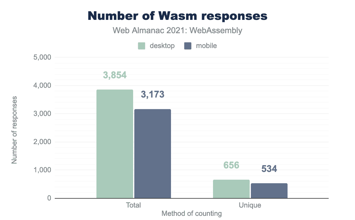 デスクトップで3854、モバイルで3173のWebAssemblyリクエストが確認されました。これらのWasmモジュールはデスクトップでは2724ドメイン、モバイルでは2300ドメインで使用されており、デスクトップとモバイルの全ドメインのそれぞれ0.06%と0.04%に相当します。