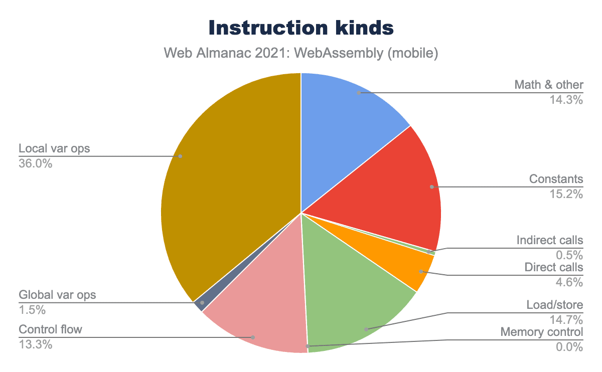 この分布から得られる1つの驚くべきことは、ローカル変数の操作、つまり local.get, local.set, local.tee が最大のカテゴリーで36%を占め、次のカテゴリーであるライン定数 (15.2%), ロード/ストア操作 (14.7%) とすべての数学および論理演算 (14.3%) をはるかに上回っていることです。ローカル変数演算は、通常、コンパイラの最適化パスの結果として生成されます。これは、高価なメモリアクセス操作を可能な限りローカル変数にダウングレードし、その後、エンジンがこれらのローカル変数をCPUレジスタに置くことで、より安価にアクセスできるようにするためです。