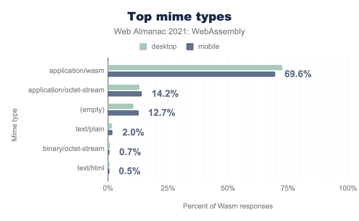 興味深いことに、もっとも人気のあるMIMEタイプを見ると、Content-Type: application/wasmが圧倒的に人気がある一方で、すべてのWasmレスポンスをカバーしているわけではないことがわかります。.wasmの拡張子を持つ他のURLも含めてよかったです。