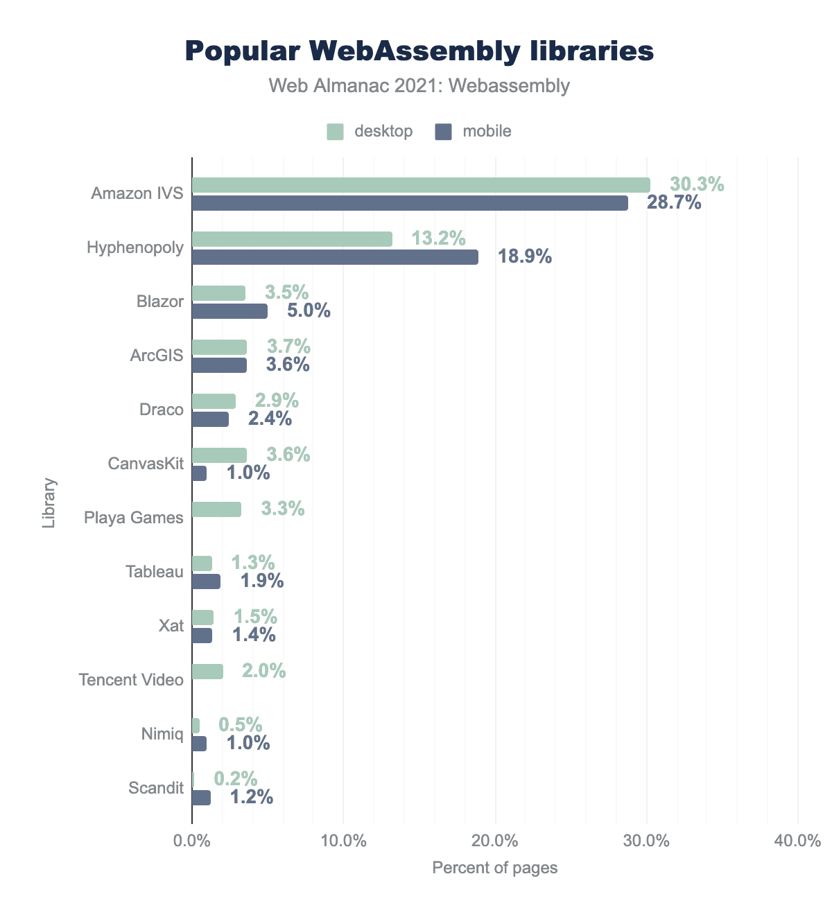 次に、Hyphenopolyは、さまざまな言語のテキストをハイフンでつなぐためのライブラリで、デスクトップとモバイルでそれぞれ13%と19%のWasmリクエストを占めています。JavaScriptとAssemblyScriptで構築されています。