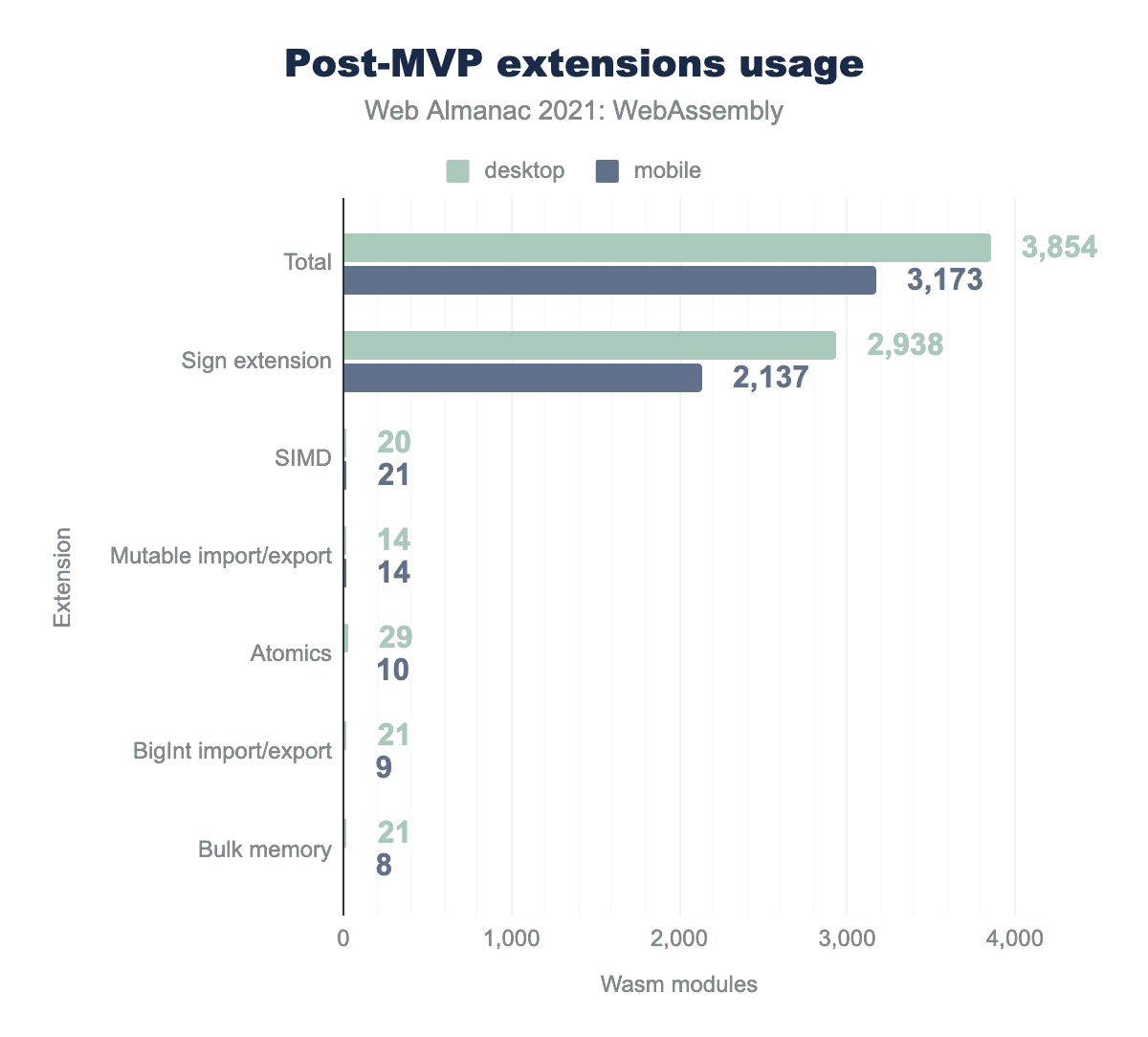 残り、使用されている機能の中で、とくに興味深いのはSIMDとatomicです。どちらも、さまざまなレベルで実行を並列化し、高速化するための命令を提供します。SIMD により、一度に複数の値に対して数学演算を行うことができ、atomicにより Wasmにおけるマルチスレッドの基礎が提供されます。それらの機能はデフォルトでは有効ではなく、特定のユースケースを必要とし、とくにマルチスレッドはソースコードで特別なAPIを使用する必要があり、さらにWebサイトで使用する前 cross-origin isolated にするための追加設定も必要です。そのため、比較的低い利用レベルであることは当然ですが、時間の経過とともに成長していくことが期待されます。