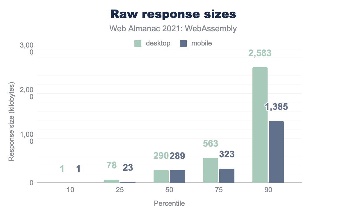 中央値は約290KBで、半分が290KB以下、半分がそれ以上のダウンロード量ということになります。Wasmの全レスポンスの90%は、デスクトップで2.6MB未満、モバイルで1.4MB未満に留まっています。