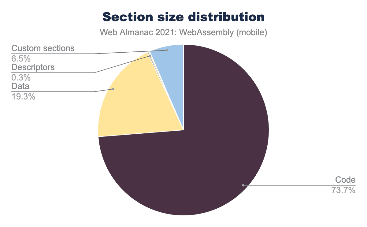 当然のことながら、バイナリサイズの大部分(~74%)はコンパイルされたコード自身によるもので、その次に埋め込まれた静的データが~19%となっています。関数型、インポート/エクスポート記述子などは、総サイズのごく一部を構成しているに過ぎません。カスタムセクションは、モバイルデータセットにおける総サイズの約6.5%を占めています。