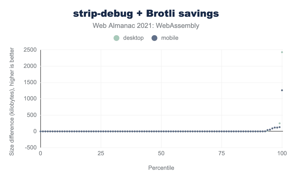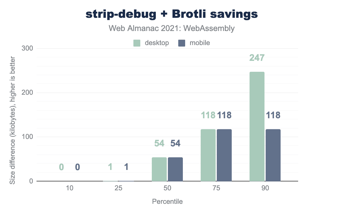 グラフからわかるように、いくつかのファイルのカスタムセクションは無視できるほど小さいですが、中央値は54KBで、90パーセンタイルはデスクトップで247KB、モバイルで118KBです。デスクトップとモバイルで最大のWasmバイナリで2.4MB/1.3MBの節約となり、とくに低速接続ではかなり顕著な改善となりました。