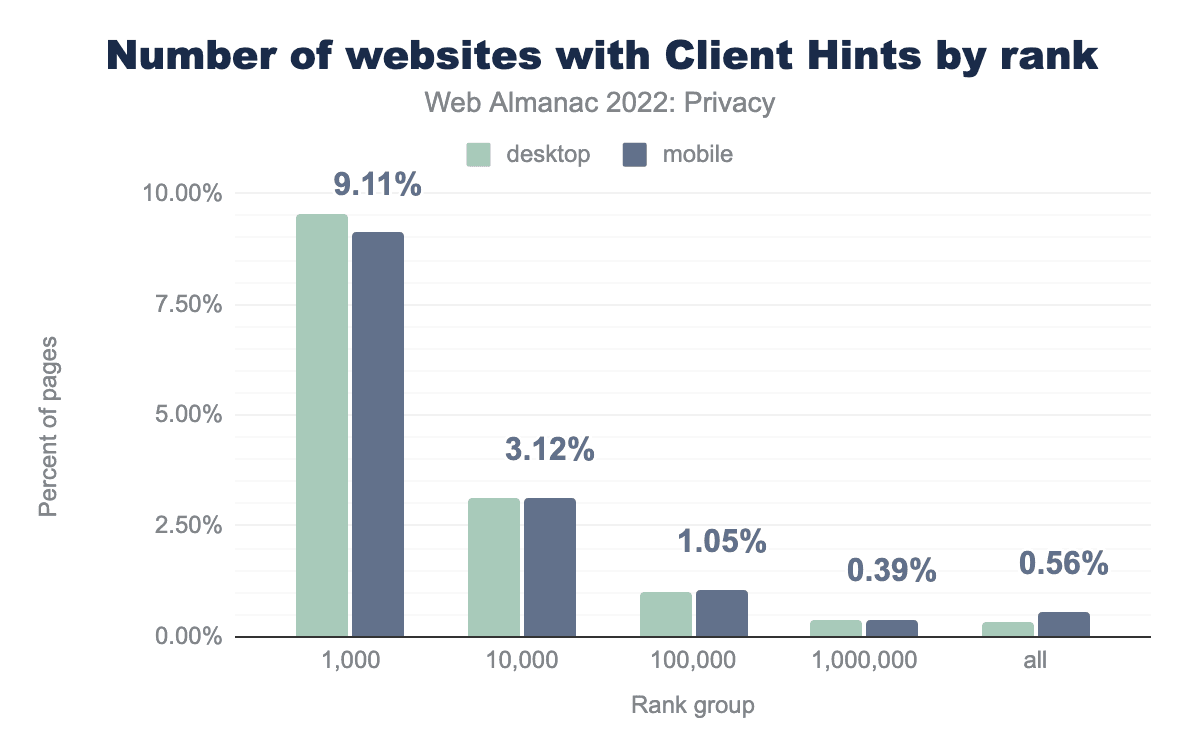 昨年(トップ1k:3.56%、トップ10k:1.44%)と比較して、Accept-CHヘッダーで応答するサイトの採用を見ると、特に最も人気のあるサイトでの採用がほぼ3倍に増加しています。この採用の増加は、ChromiumがUser-Agent文字列で共有される情報を減らしている事実(User-Agent Reduction planを通じて)に関連していると考えられます。
