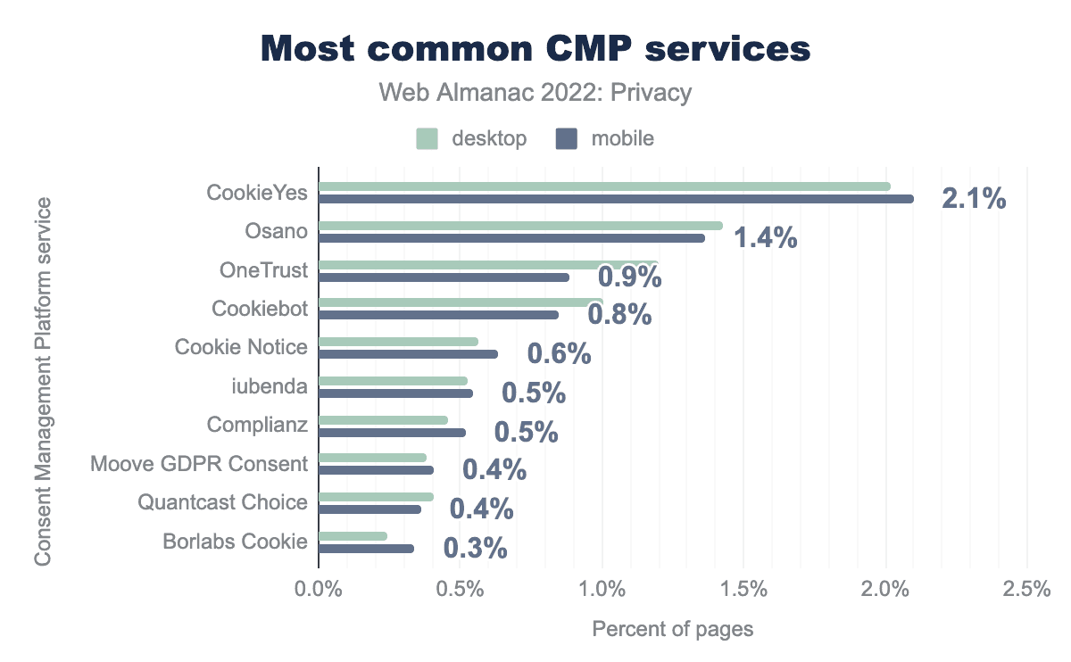 私たちの分析によると、CMPの使用は昨年から11%へと7%から増加し、ほぼ60%の増加を記録しました。また、今年はモバイルよりもデスクトップの方が関与が少ないことが見て取れますが、その差は最小限です。 また、CookieYes(18%増)、OneTrust(64%増)、Cookiebot(56%増)といったプロバイダーが昨年から市場シェアを増やしていることも確認できます。