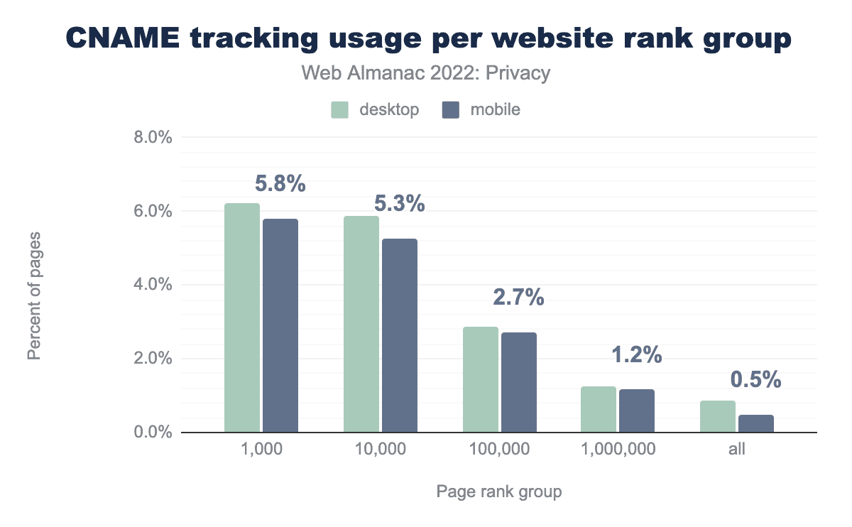 CNAMEベースのトラッキングの全体的な普及率は非常に高くはないかもしれません(デスクトップウェブサイトで0.9%、モバイルサイトで0.5%)が、その採用は主に非常に人気のあるウェブサイトに集中しています。訪問されたウェブサイトのトップ1,000では、デスクトップサイトの6.2%とモバイルサイトの5.8%がCNAMEトラッカーを組み込んでいます。これは、ユーザーがウェブを閲覧する際にこのようなトラッカーに遭遇する可能性が高いことを意味します。