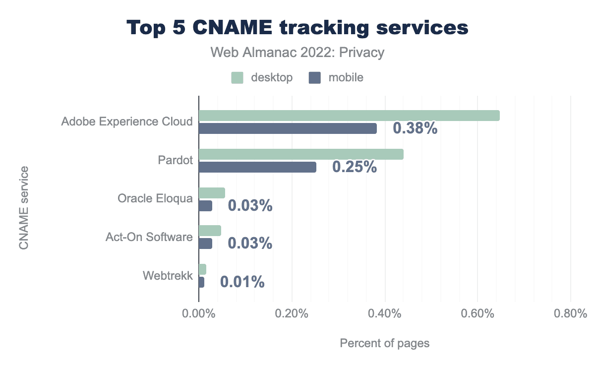 さまざまなCNAMEトラッカーを分析すると、市場シェアは主に2つの主要サービス、Adobe Experience Cloud(デスクトップで0.65%、モバイルで0.38%)とPardot(デスクトップで0.25%、モバイルで0.44%)に集中していることがわかります。興味深いことに、CNAMEトラッキングの採用はモバイルで訪問されたウェブサイトよりもデスクトップブラウザで訪問されたウェブサイトで著しく高いです。これは、モバイルブラウザにはプライバシーを保護するメカニズムが少ないためと思われます。たとえば、モバイルの人気ブラウザのほとんどは拡張機能をサポートしていません。