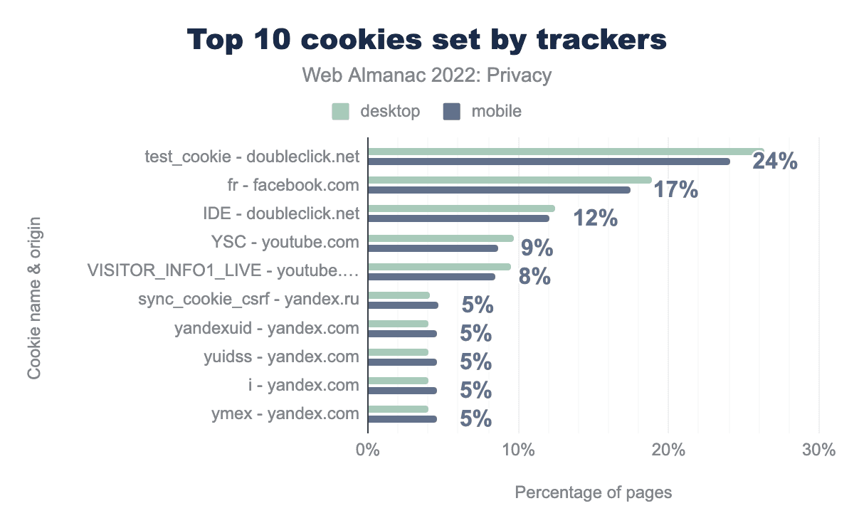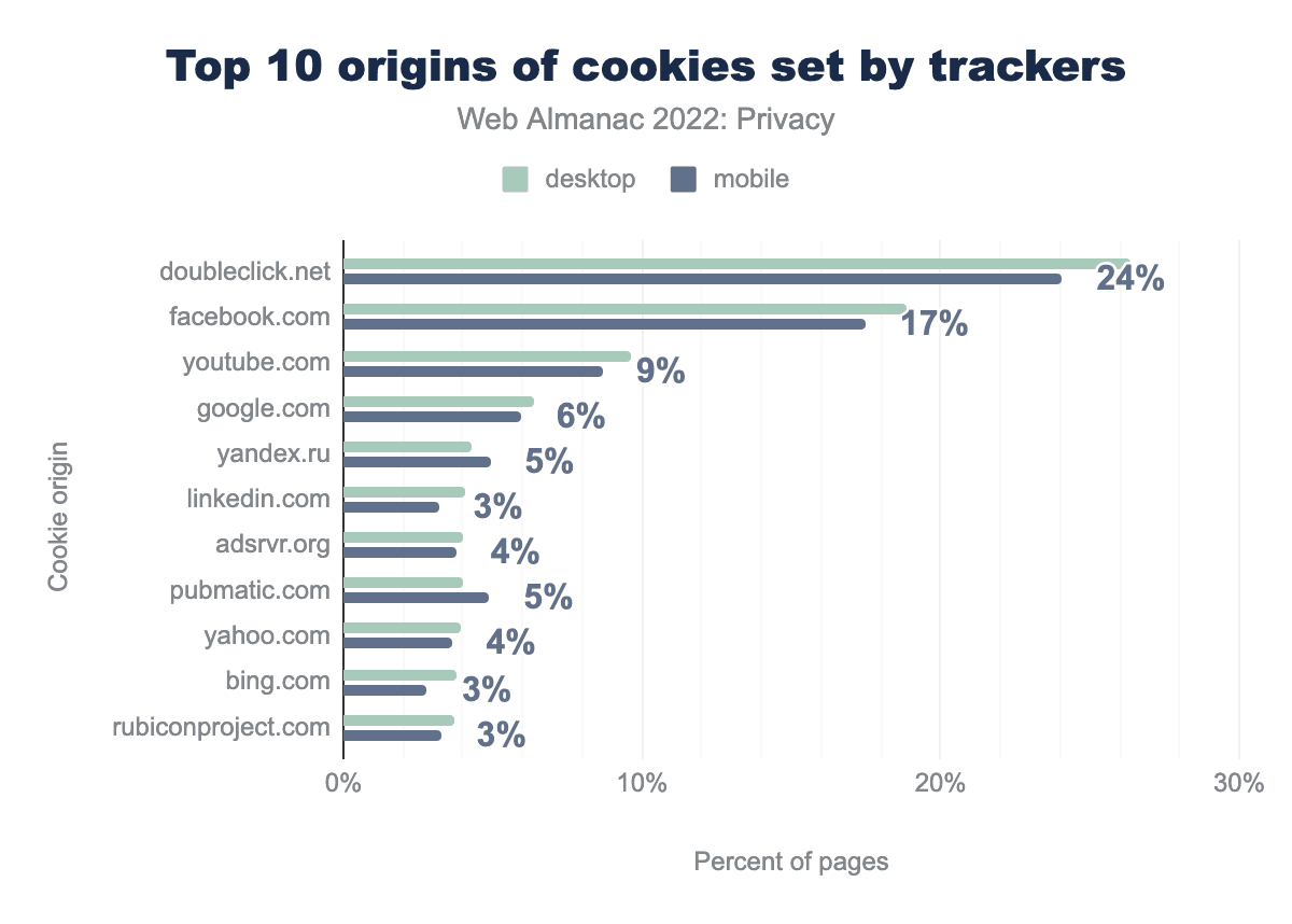 大部分において、クッキーを設定するサードパーティのトラッカーはウェブサイトに含まれるサードパーティと一致しています。しかし、最も人気のあるサードパーティのトラッカーであるGoogleアナリティクスはここではそれほど普及していません。これは、Googleアナリティクスがファーストパーティクッキー(_ga)を設定し、それが彼らの定義によると「特定のプロパティに固有であるため、関連性のないウェブサイト間で特定のユーザーやブラウザを追跡するために使用することはできません」とされているためです。それにもかかわらず、サードパーティクッキーを設定する最も一般的な追跡ドメインは、依然としてGoogleに関連するdoubleclick.netです。リスト上の他のドメインはソーシャルメディアと広告に関連しています。