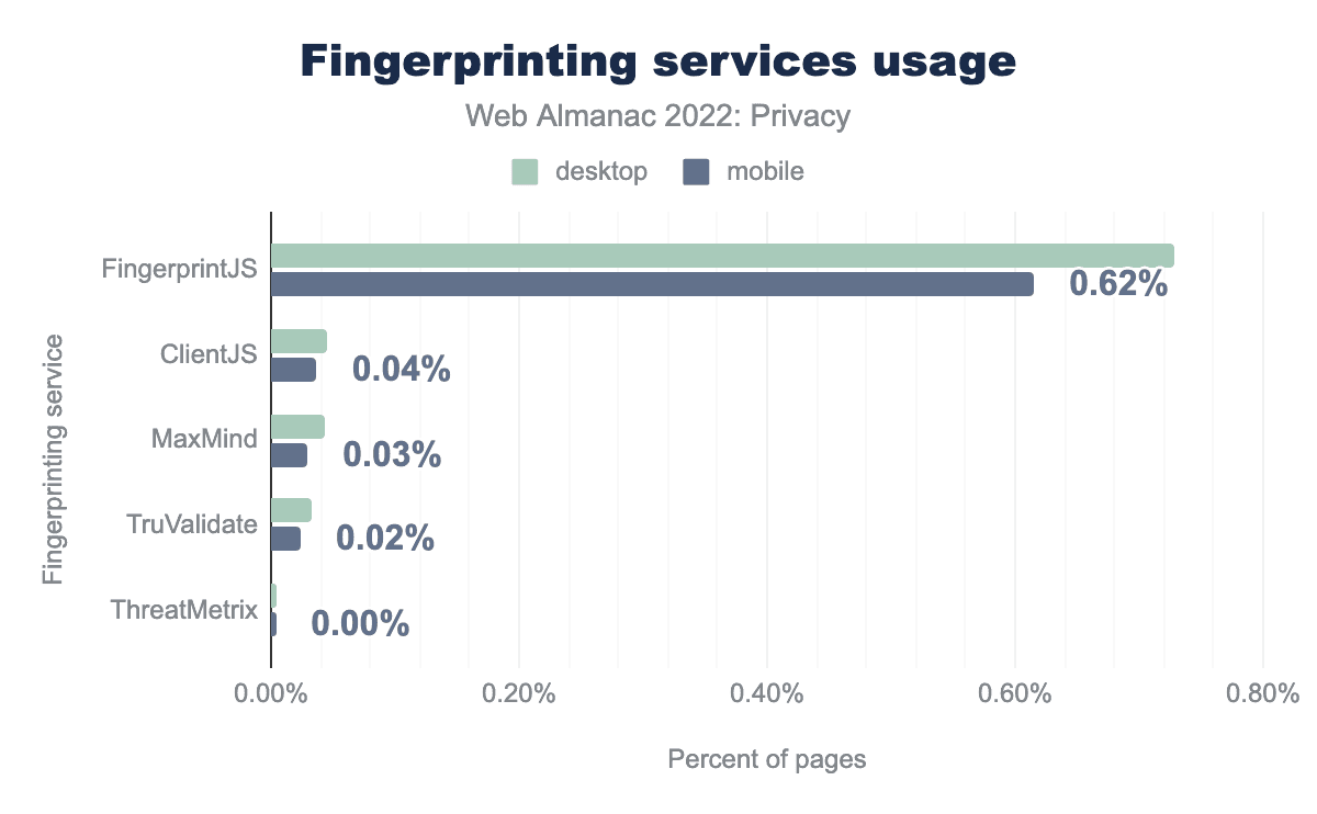 私たちの分析では、5つの異なる、知られているフィンガープリンティングライブラリを調べ、ウェブ上でフィンガープリンティングを実行するために最も普及しているライブラリはFingerprintJSであり、全てのウェブサイトの0.62%で見つかりました。これはライブラリがオープンソースで、無料版があるためであると考えられます。昨年の測定と比較して、フィンガープリンティングの使用はほぼ変わっていないことがわかります。