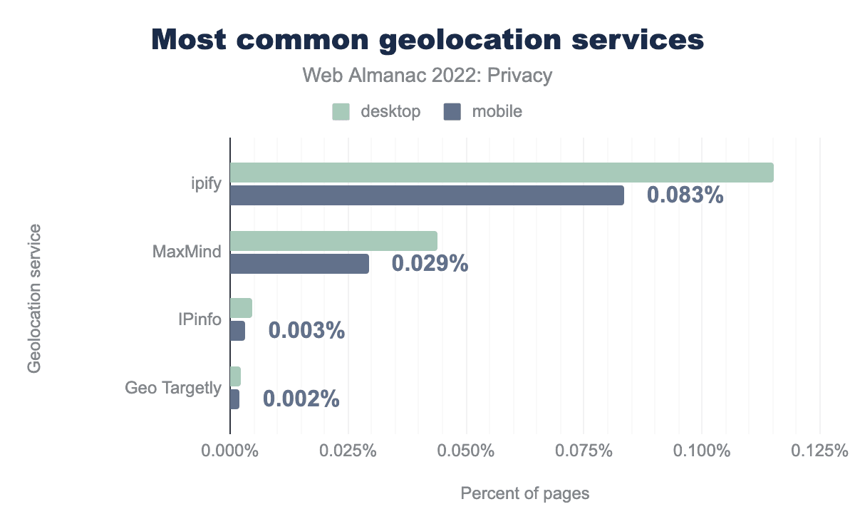 私たちがウェブサイトを訪れる場所に基づいてローカライズされたコンテンツが多く提供されています。ウェブ開発者が訪問者の位置を特定するためには、サードパーティのジオロケーションサービスを利用できます。これらはIPアドレスに基づいてユーザーの位置を特定します。このジオロケーションは通常バックエンドで使用されますが、フロントエンドでもいくつかの使用例が見られます:デスクトップサイトの0.115%とモバイルサイトの0.083%が、ユーザーのIP位置を特定するためにipifyに連絡しています。