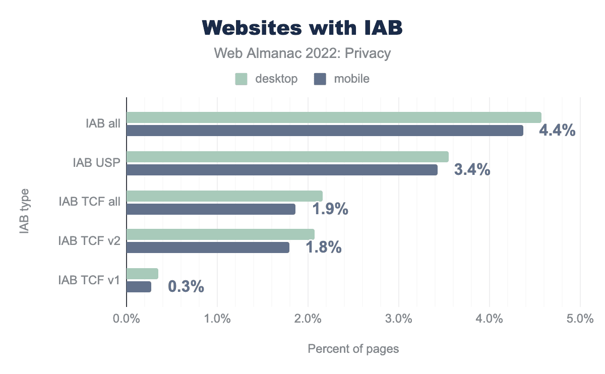デスクトップウェブサイトの4.6%で何らかのIABが使用されており、そのうち3.5%がUSPを、2.2%がIAB TCFを使用しています。これは昨年からの両仕様の使用増加を示しています。ここで注記すべきは、私たちの測定は米国ベースであるため、TCFによれば、EU外の訪問には同意バナーが必要ないため、USPを使用しているウェブサイトが多いことが理由の一つと考えられます。
