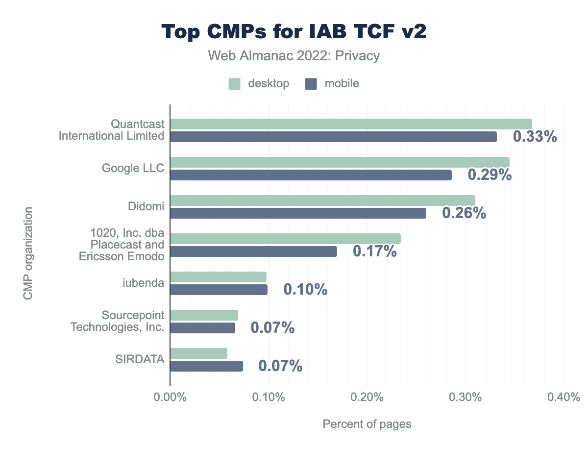 Quantcast International Limited (0.37%)、Google LLC (0.34%)、およびDidomi (0.31%) がIAB TCF v2のための人気のあるCMPプロバイダーです。