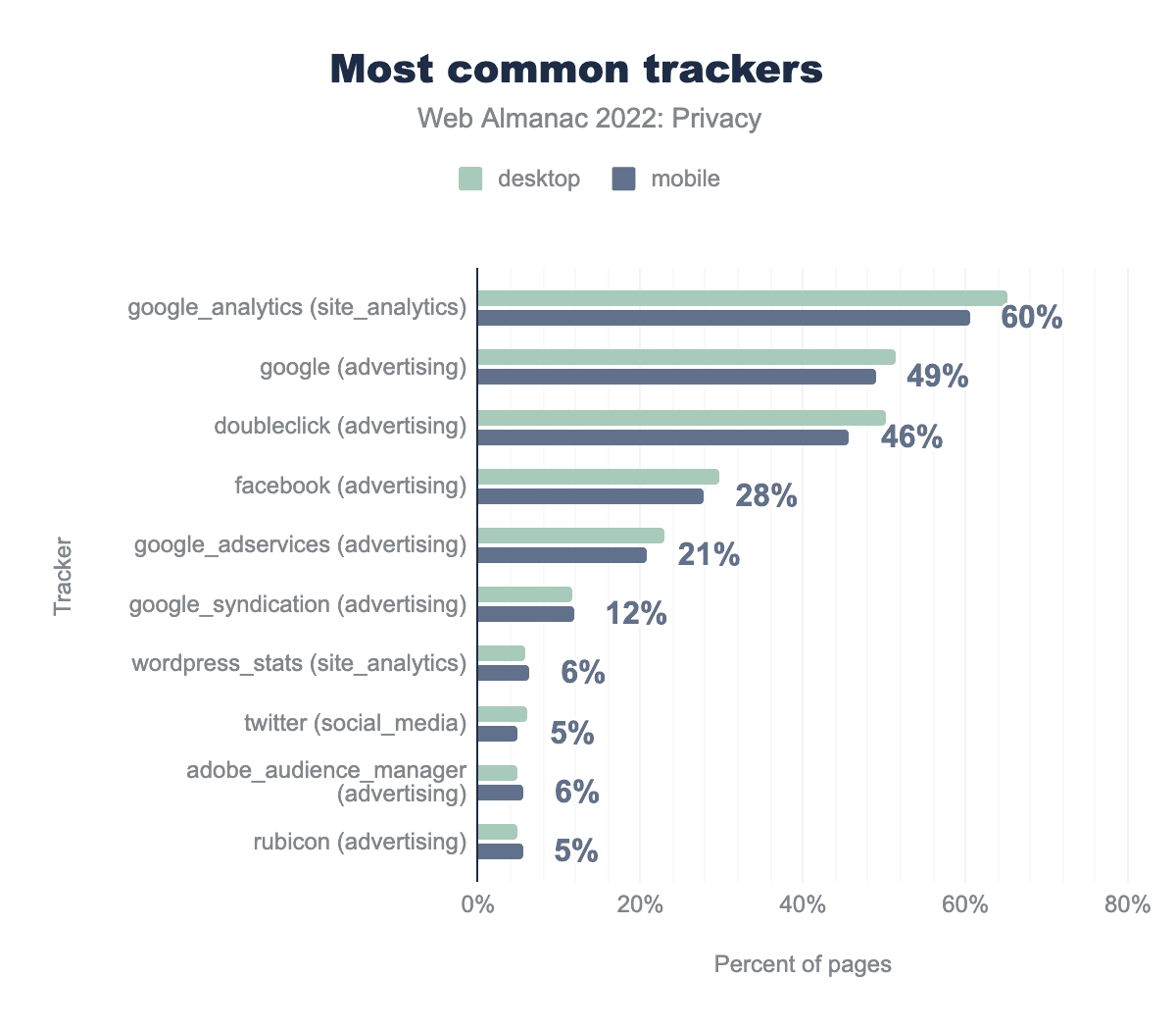追跡はウェブ上で最も広範にわたる技術の一つであり、デスクトップウェブサイトの82%(モバイルでは80%)が少なくとも1つのサードパーティトラッカーを含んでいることがわかります。オンラインでのユーザーの行動を追跡することにより、これらの追跡会社はユーザーのプロファイルを作成することができ、これはパーソナライズされた広告に使用されるほか、ウェブサイトの所有者に誰が彼らのウェブサイトを訪問しているかの洞察を与えた