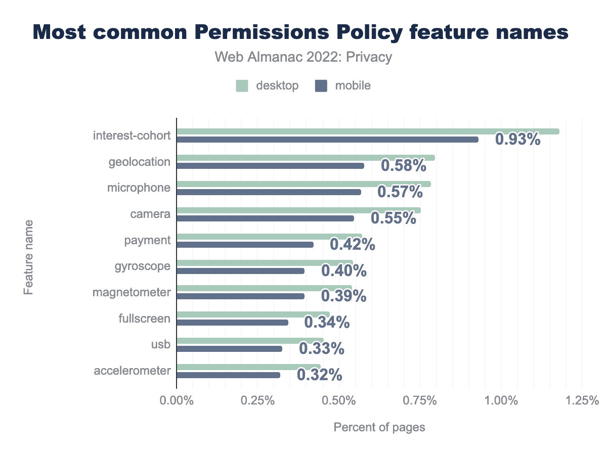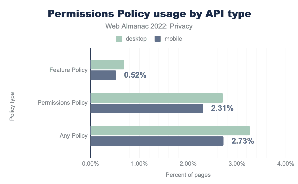デフォルトでは、サードパーティのスクリプトは、組み込まれているウェブサイトと同じブラウザ機能にアクセスできます。ウェブサイトが有効にする機能を制限するために、ウェブサイトはパーミッションポリシーを利用できます。HTTPレスポンスヘッダーを通じて、ウェブサイトはどの機能を許可するかを示すことができます。例えば、microphone機能がこのリストに含まれていない場合、ウェブページに組み込まれているスクリプトはそれを使用することができません。このポリシーは比較的新しいものですが、デスクトップサイトの2.71%、モバイルサイトの2.31%で採用が見られます。