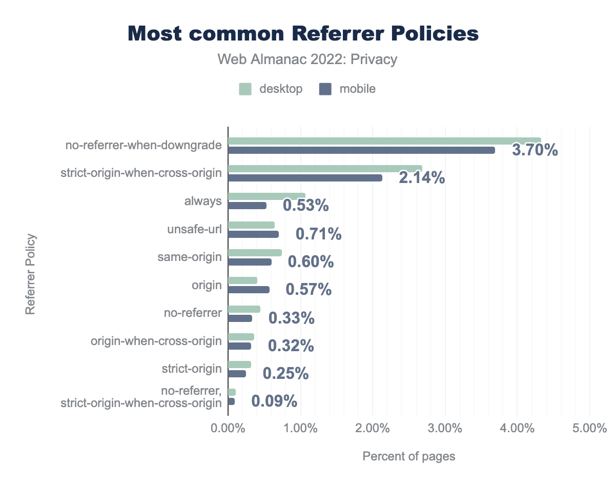 リファラーポリシーの使用状況を見ると、Refererヘッダーをダウングレードリクエストに含めないことが最も一般的です。つまり、HTTPSが有効なページで開始されたHTTPリクエストには含まれません。残念ながら、これはほとんどのシナリオでHTTPSリクエストにおいてユーザーが訪れたページが漏れることを意味します。しかし、デスクトップサイトの2.7%とモバイルサイトの2.1%がstrict-origin-when-cross-originポリシーを用いて、ユーザーが訪れた具体的なウェブページを隠そうとしています。これは現在、ポリシーが指定されていない場合のほとんどのブラウザのデフォルトです。