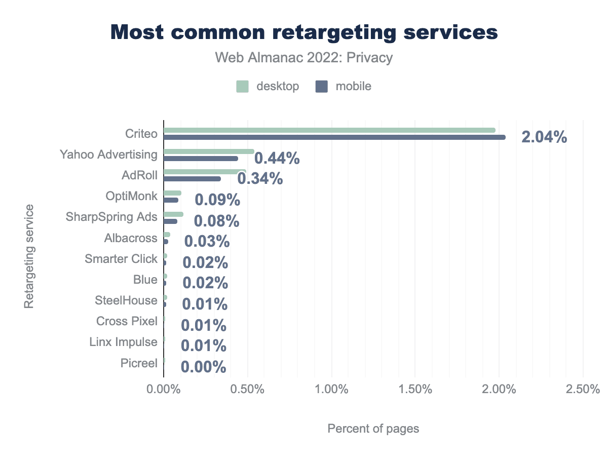 純粋にリターゲティングサービスを提供するトラッカーで最も普及しているのはCriteoで、デスクトップで1.98%、モバイルで2.04%の普及率を持っています。それに続くのはYahoo広告とAdRollで、合わせてCriteoの市場シェアの半分以下です。昨年の最も広く使用されていたリターゲティングサービスであるGoogleタグマネージャーは、今回の結果には表示されていません。これは現在「タグマネージャー」のWappalyzerカテゴリに分類されているためです。このサービスはリターゲティングに使用されますが、リターゲティングタグの含まれることによって間接的に行われ、それらのタグは別々に検出されます。