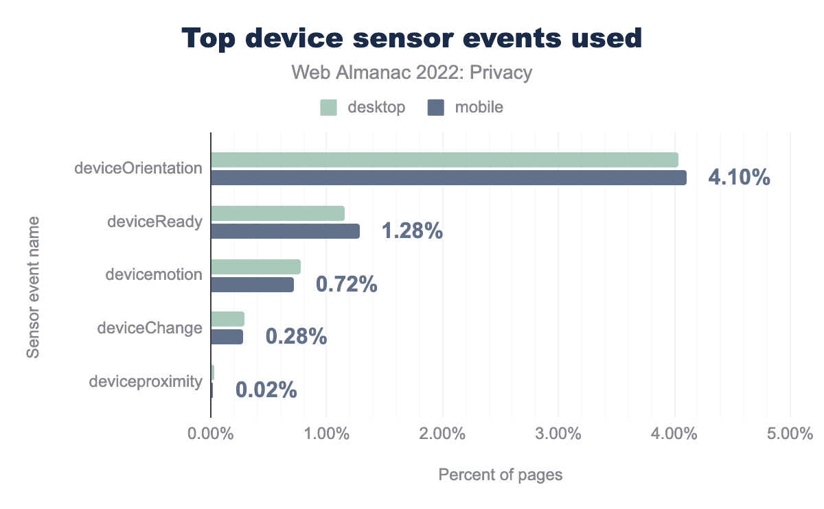 ウェブサイトが最も注目しているセンサーイベントはdeviceOrientationイベントであり、デバイスがポートレートモードからランドスケープモードに変わる、またはその逆の場合に発生します。デスクトップウェブサイトの4.0%、モバイルウェブサイトの4.1%で使用されています。使用率が(比較的)高いのは、デバイスの向きが変わるとウェブサイトがレイアウトの要素を更新したいと考えるかもしれないからです。