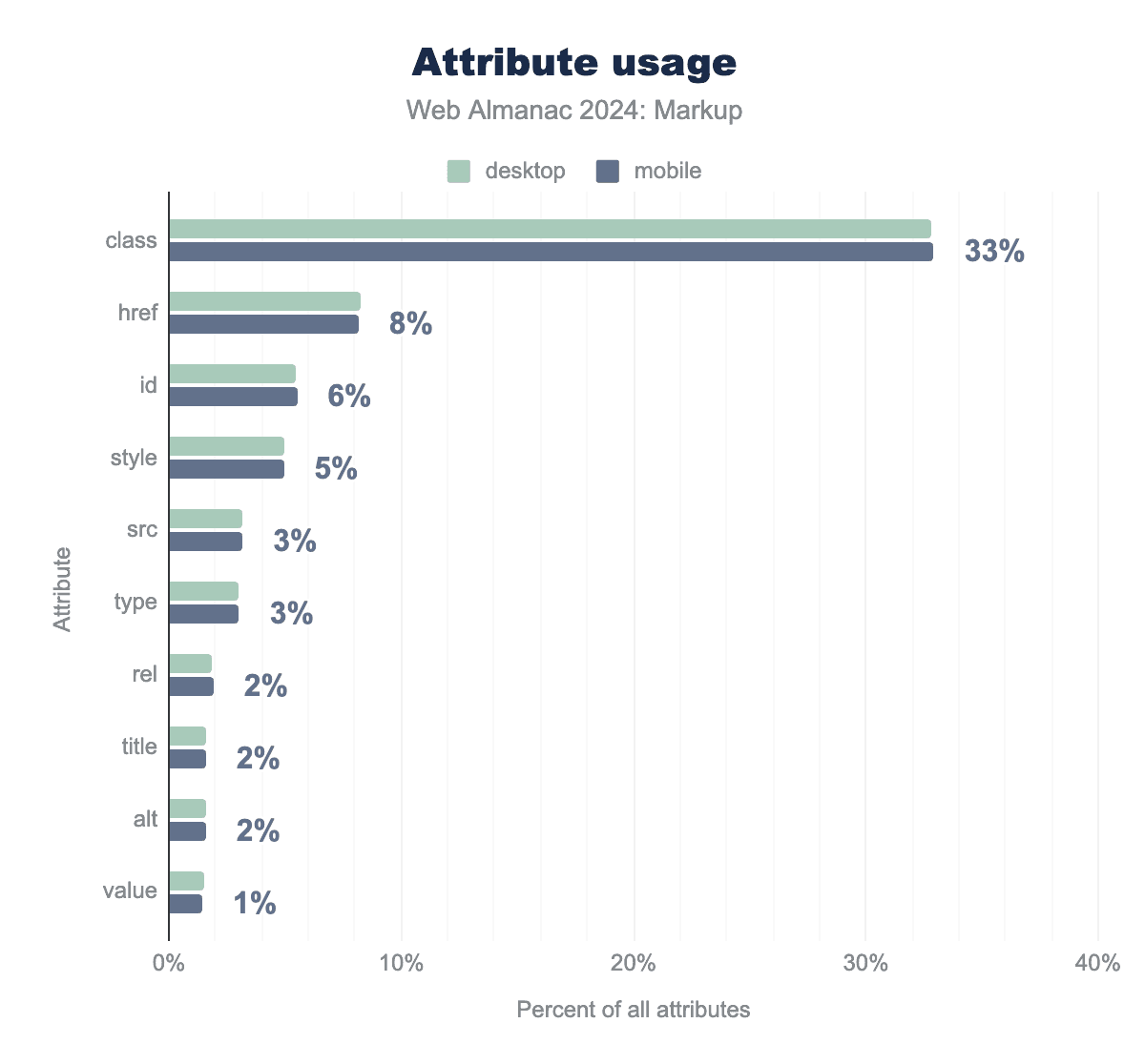 今年も、もっとも使用されている属性は圧倒的にclassで、モバイルデータセットで480億回出現し、使用されているすべての属性の33%を占めています。