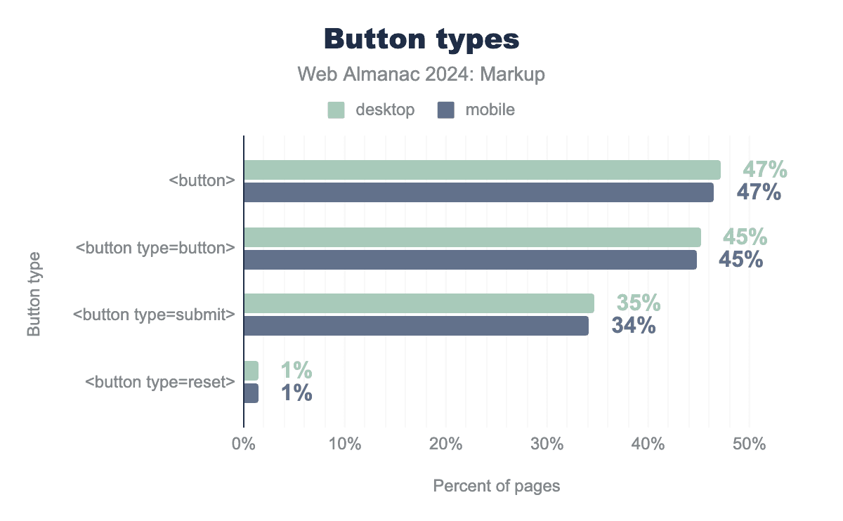 <button>がもっとも使用されており(データセットのモバイルページの47%に存在)、次いで<button type=button>(モバイルで45%)、<button type=submit>(モバイルで34%)、<button type=reset>(モバイルで1%)となっています。デスクトップはほとんどの場合でわずかに高いものの、1パーセントポイント以内です。詳しく内訳を見てみましょう: