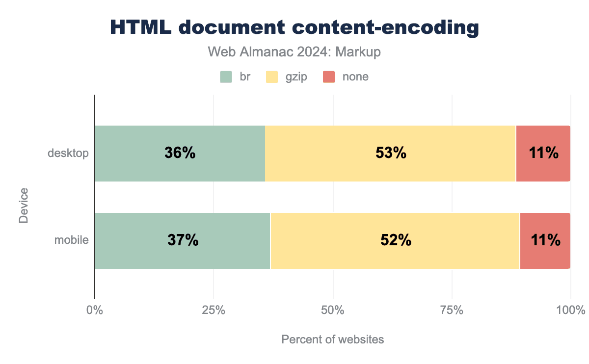これらの改善にもかかわらず、HTMLファイルの一部(モバイルで10.5%)は依然として圧縮なしで提供されており、最適化の機会を逃しています。