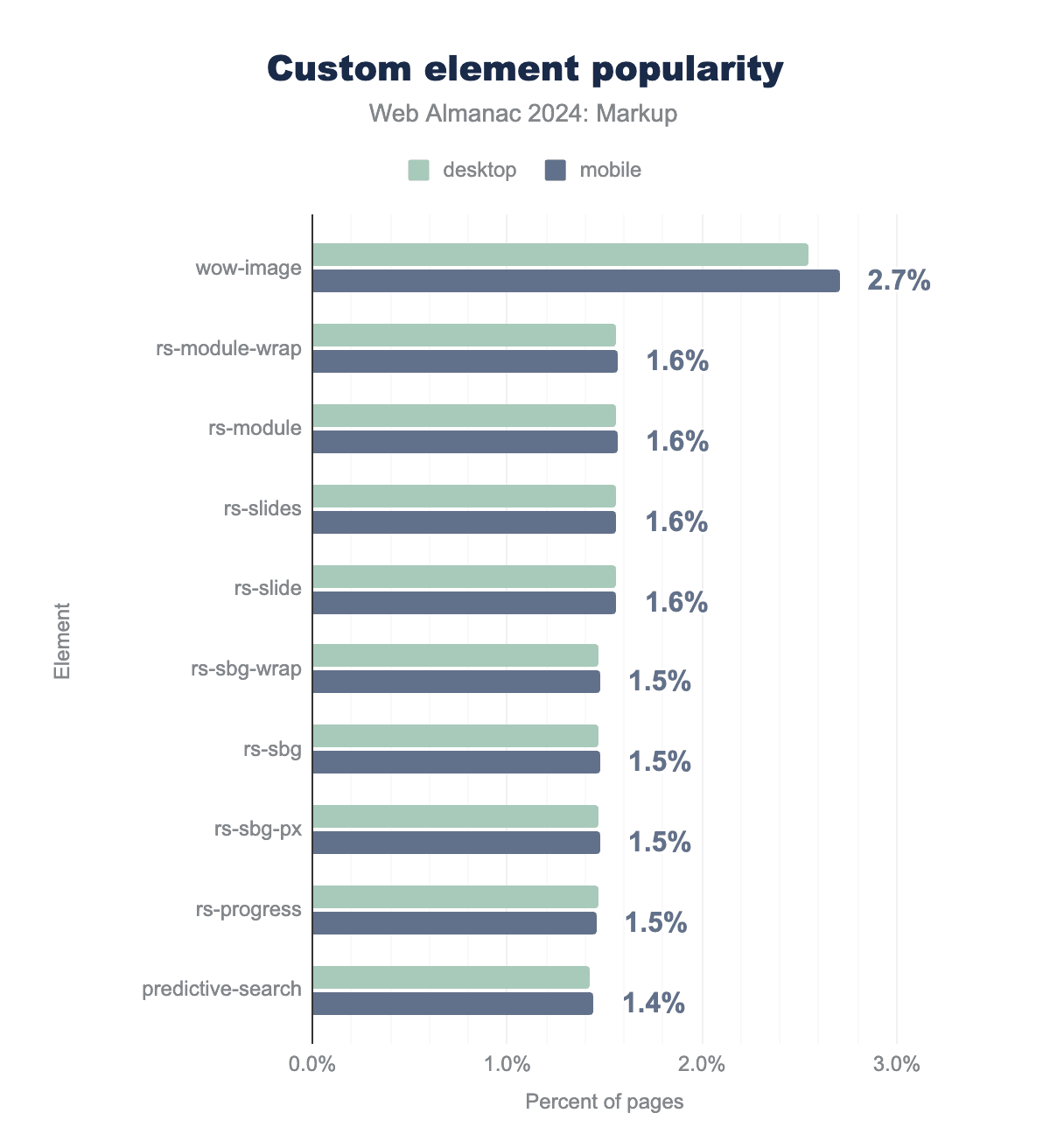 2022年版でも述べたように、トップ10のカスタム要素のほとんどはSlider Revolutionの rs-* 要素が占めています。しかし、今年は新しい(そして意外な)1位が登場しました:wow-image 要素です。これはWixサイトで使用される@wix/image パッケージによって使用されています。