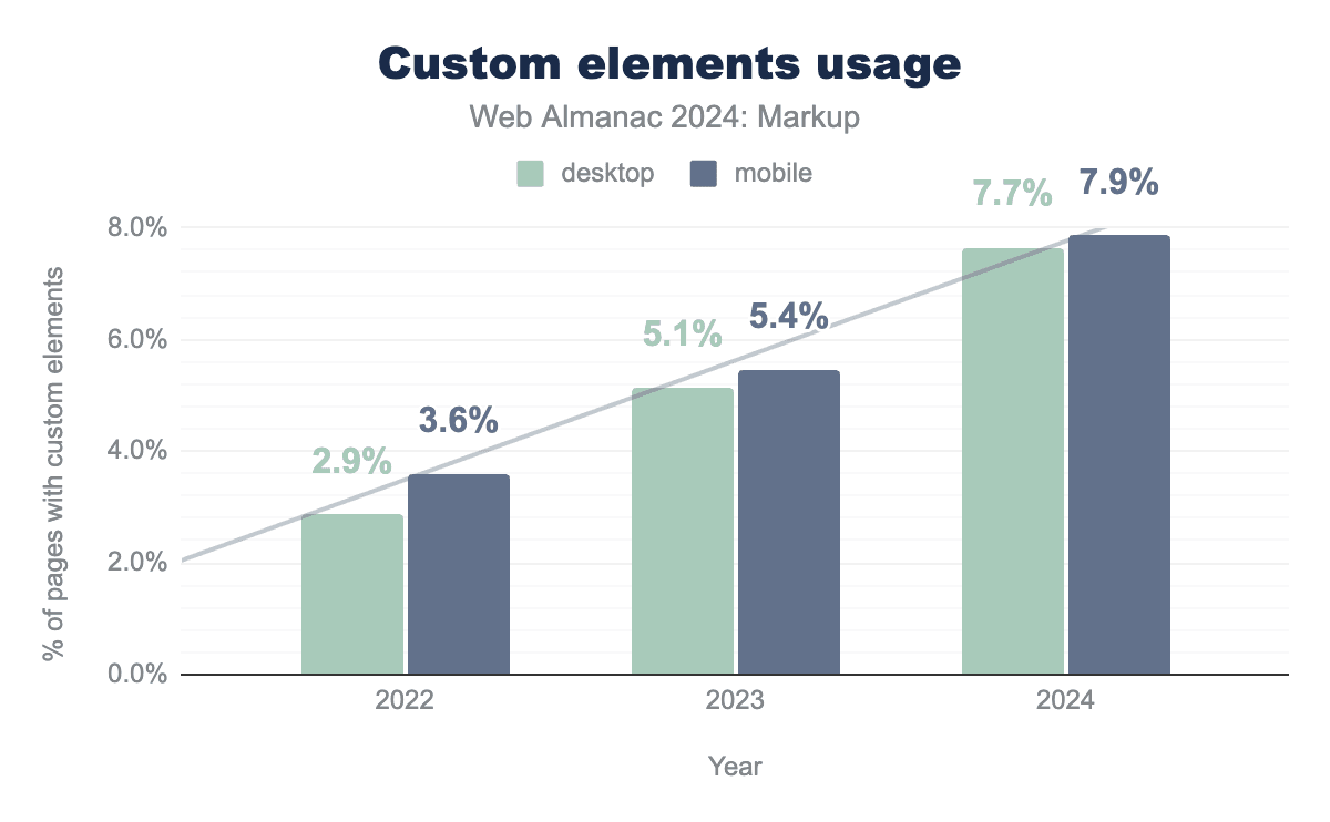 カスタム要素の使用は近年大幅に増加しており、モバイルでの採用率は2022年の 3.6% から2024年には 7.9% に上昇しています。この増加は、開発者とテクノロジーがよりリッチでインタラクティブなウェブ体験を構築するためにカスタム要素を活用する成長傾向を示しています。