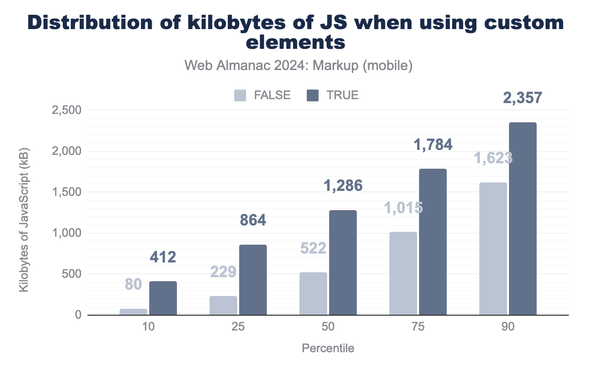 このグラフでは、中央値でカスタム要素を使用するページは1,286 kBのJavaScriptを使用するのに対し、カスタム要素を使用しないページは522 kBしか必要としないことがわかります。したがって、カスタム要素の台頭はウェブ開発における価値ある進化を表しており、開発者がモジュラーで再利用可能なコンポーネントを作成できるようになりましたが、その使用の影響を考慮することが重要です。
