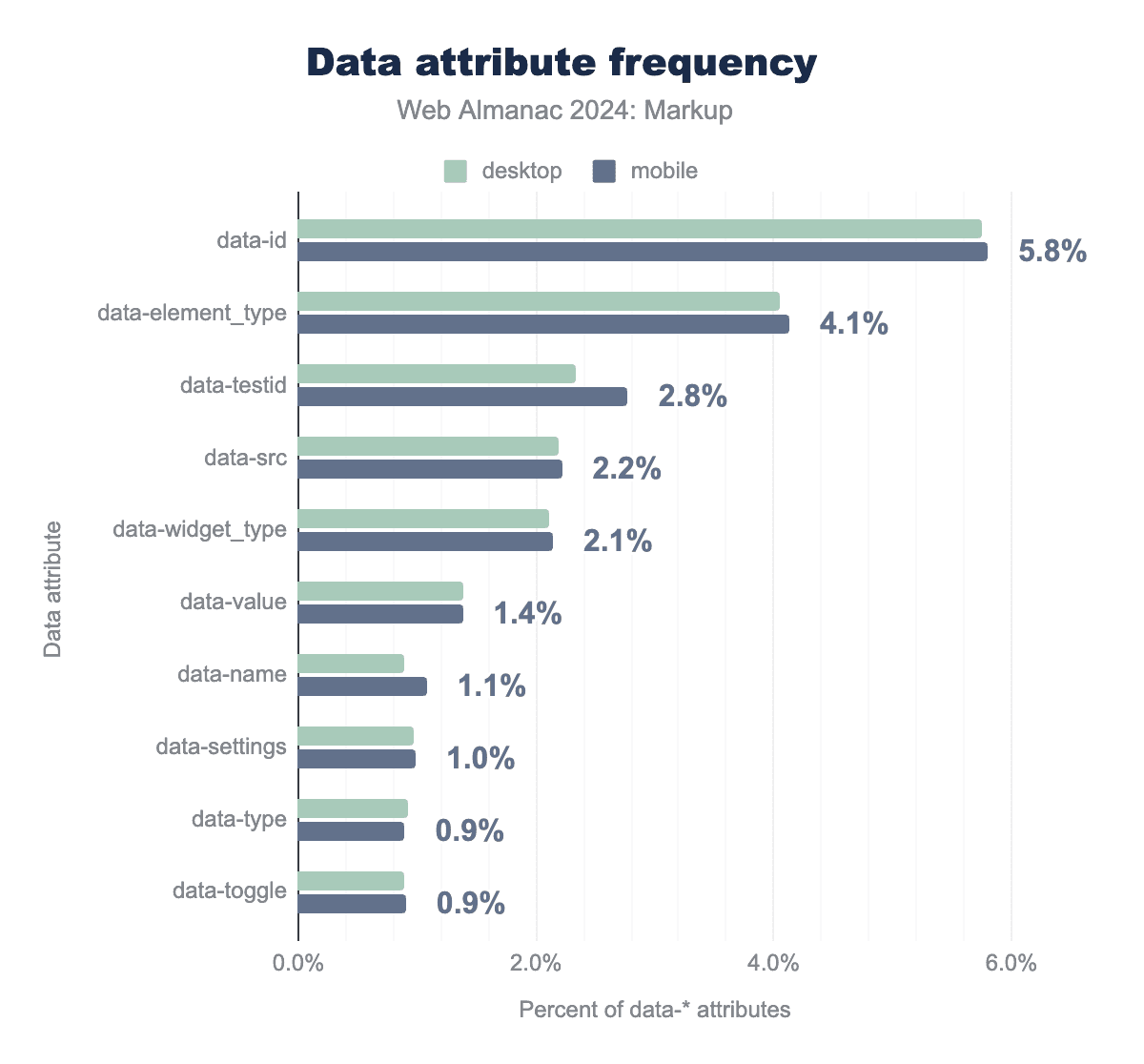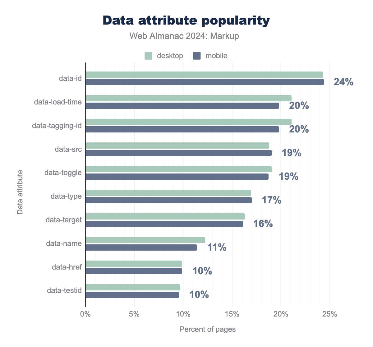 もう1つの注目すべき変化は、リストに新しい要素が登場したことです:data-load-timeとdata-tagging-idは2024年にページの20%で出現し、ランキングの2位と3位を占めています。これらの属性は2022年に特定されたdata-*属性には含まれていなかったもので、パフォーマンス追跡とタグ付けがモダンなウェブ開発でより重要になっていることを示しています。