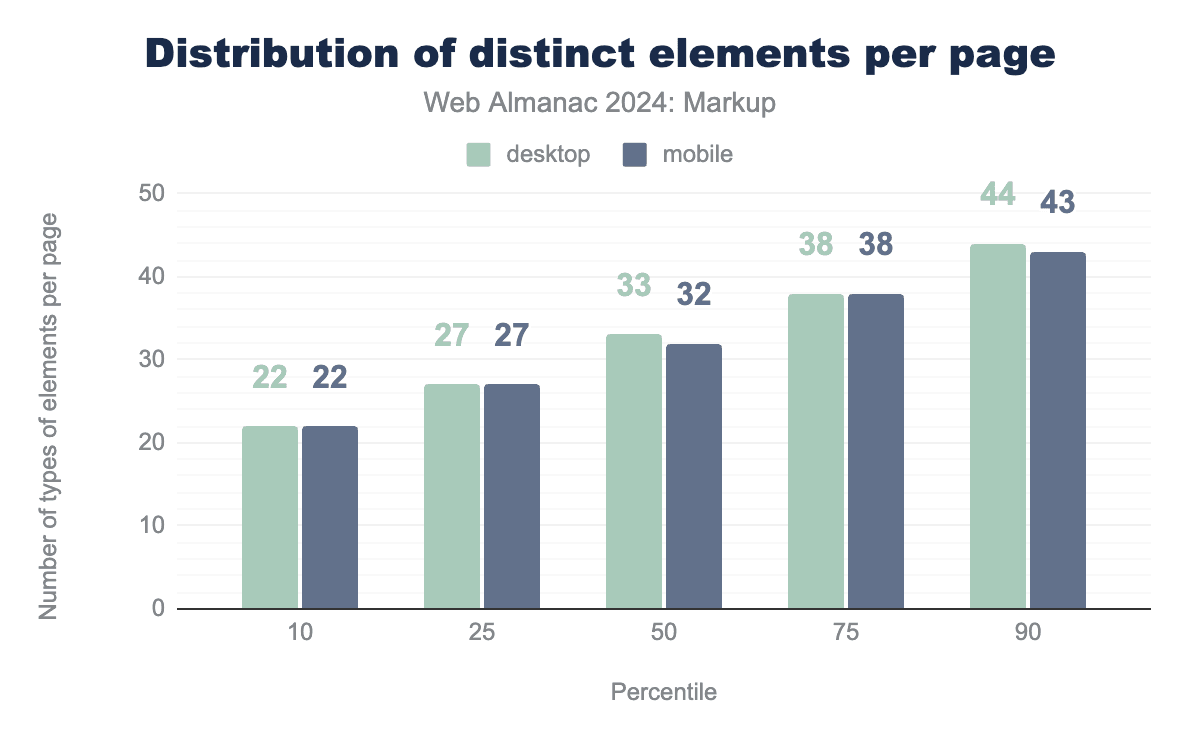 デスクトップとモバイルの両方のページで、10パーセンタイルでは22の異なる要素があり、90パーセンタイルではデスクトップで44要素、モバイルで43要素に達しています。モバイルページの異なる要素の中央値は今年も32で一貫しており、2022年と同じで、2021年の31からわずかに高くなっています。