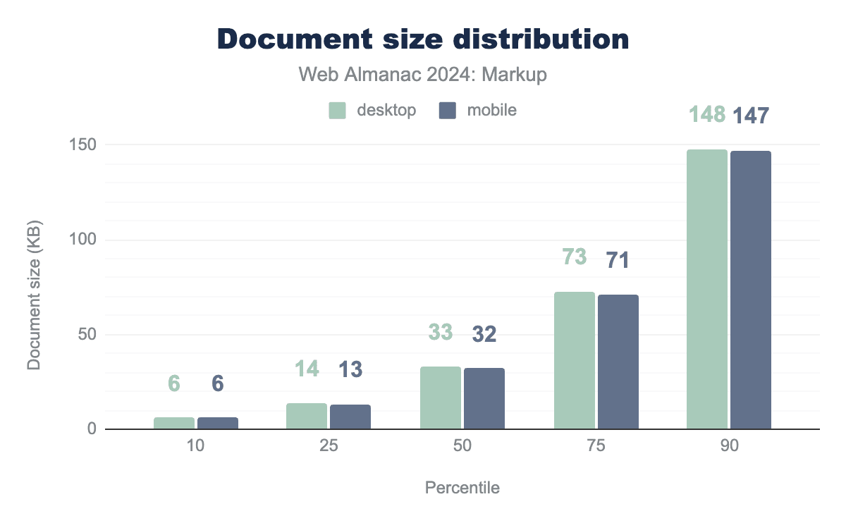パーセンタイルの分布を見ると、10パーセンタイルではHTMLファイルは6 KBと小さく、90パーセンタイルでは147 KBに達します。この極端な差は、開発者がページをどのように構造化しているかに大きな違いがあることを示しています。