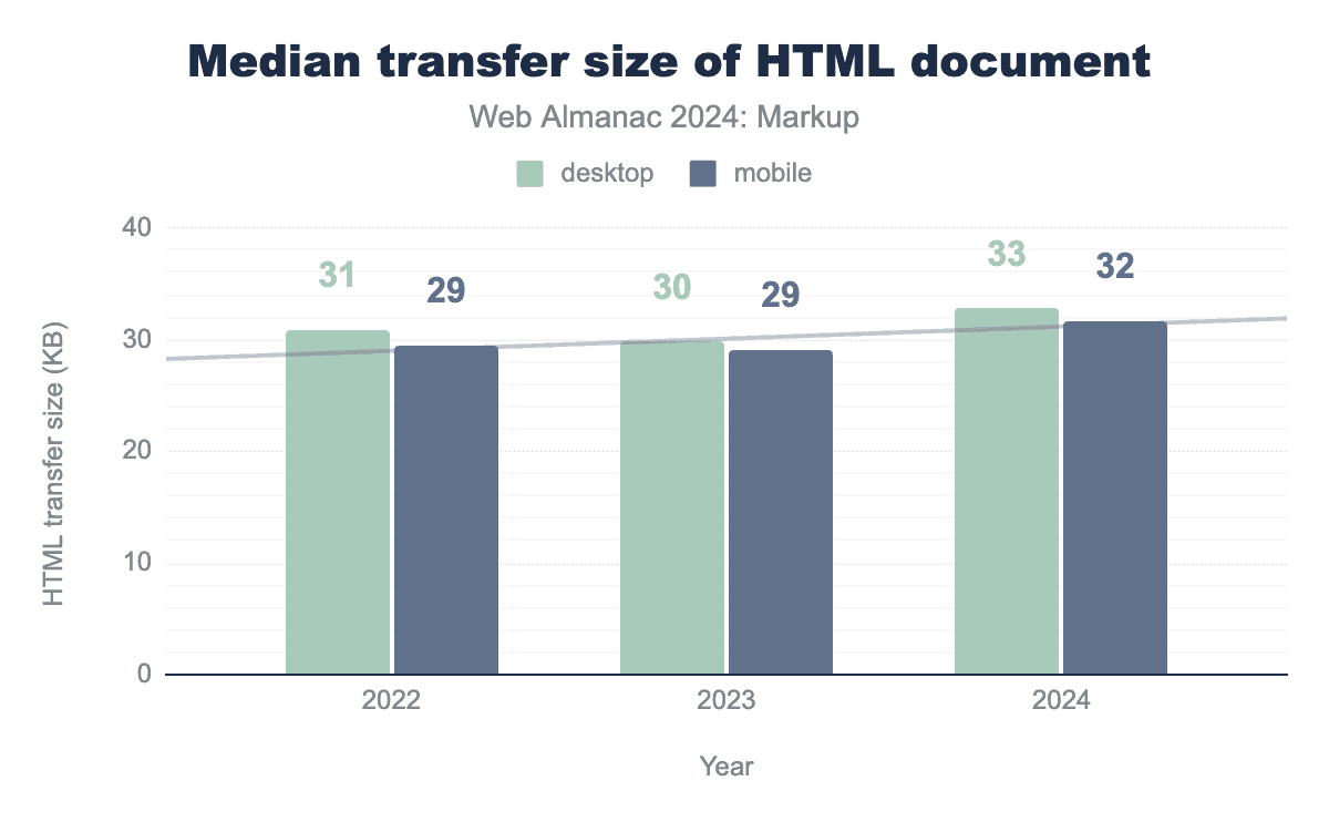 2023年にわずかな減少を見せた後、HTML転送サイズは2022年と2023年と比較して今年は増加しました。