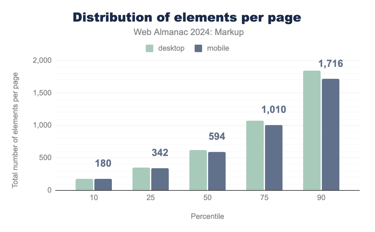 ただし、ページごとの要素の分布を確認すると、いくつかの違いがあります。データは2022年と比較してわずかな減少を示しています。モバイルでは、要素の中央値が2022年の653から2024年には594に減少しています。下位の10パーセンタイルでは、モバイルで192から180へのわずかな減少を示しています。90パーセンタイルもわずかな減少を示し、モバイルページは1,832から1,716に減少しています。この全体的な減少は、使用されるHTML要素の数の面でページがわずかにスリム化していることを示唆しています。