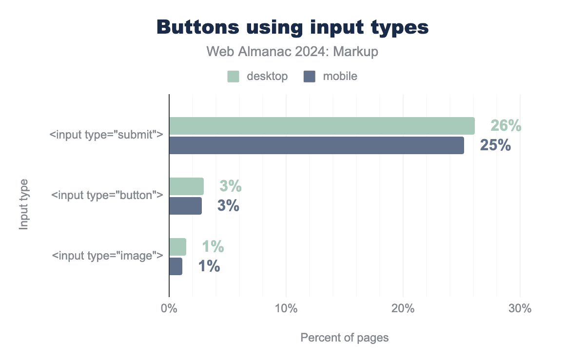 <input type="submit">がもっとも使用されており(データセットのモバイルページの25%に存在)、次いで<input type="button">(モバイルで3%)、<input type="image">(モバイルで1%)となっています。デスクトップはほとんどの場合でわずかに高いものの、1パーセントポイント以内です。データによると、データセットのモバイルページの25.2%が少なくとも1つの<input type="submit">要素を持ち、2.8%が少なくとも1つの<input type="button">要素を持ち、1.1%が少なくとも1つの<input type="image">要素を持っています。