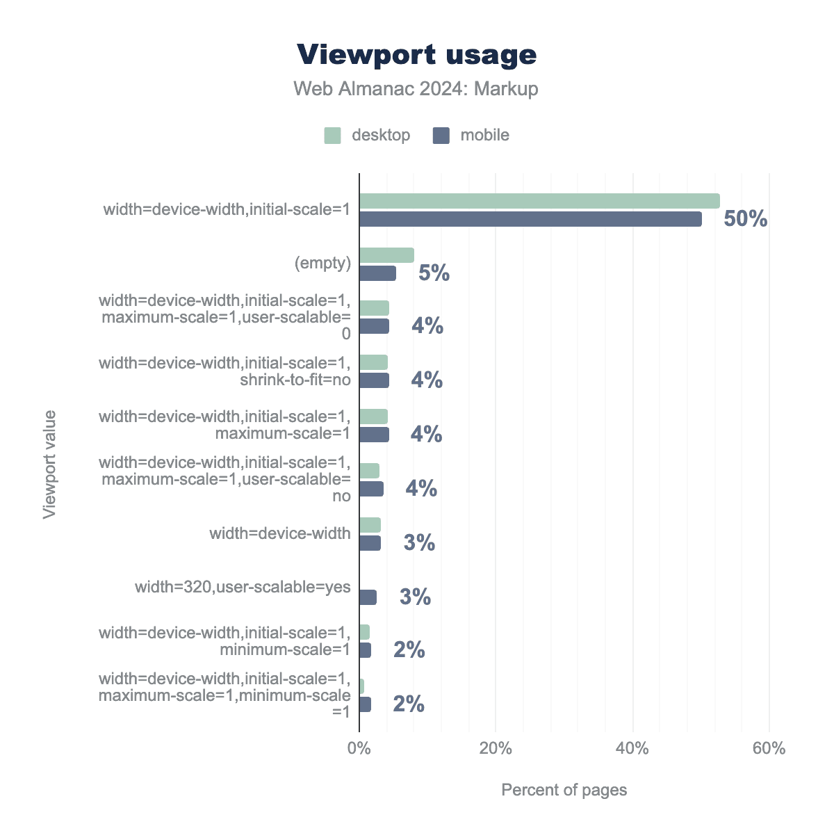 width=device-width,initial-scale=1 がもっとも使用されており(データセットのモバイルページの50%に存在)、次いで (empty) (モバイルで5%)、width=device-width,initial-scale=1,maximum-scale=1,user-scalable=0 (モバイルで4%)、width=device-width,initial-scale=1,shrink-to-fit=no (モバイルで4%)、width=device-width,initial-scale=1,maximum-scale=1 (モバイルで4%)となっています。トップ10の残りは width=device-width,initial-scale=1,maximum-scale=1,user-scalable=no、width=device-width、width=320,user-scalable=yes、width=device-width,initial-scale=1,minimum-scale=1、width=device-width,initial-scale=1,maximum-scale=1,minimum-scale=1 で、値は4%から2%の範囲です。現在の使用状況では、もっとも一般的な設定は width=device-width,initial-scale=1 で、モバイルページの50%に存在します。興味深いことに、分析したモバイルページの5.4%にビューポートタグがありません。つまり、これらのページはモバイル向けに設計されていないということです。その他の設定には、ユーザーのスケーリングを無効にする width=device-width,initial-scale=1,maximum-scale=1,user-scalable=0 などのバリエーションがあり、モバイルページの4.4%で見られます。