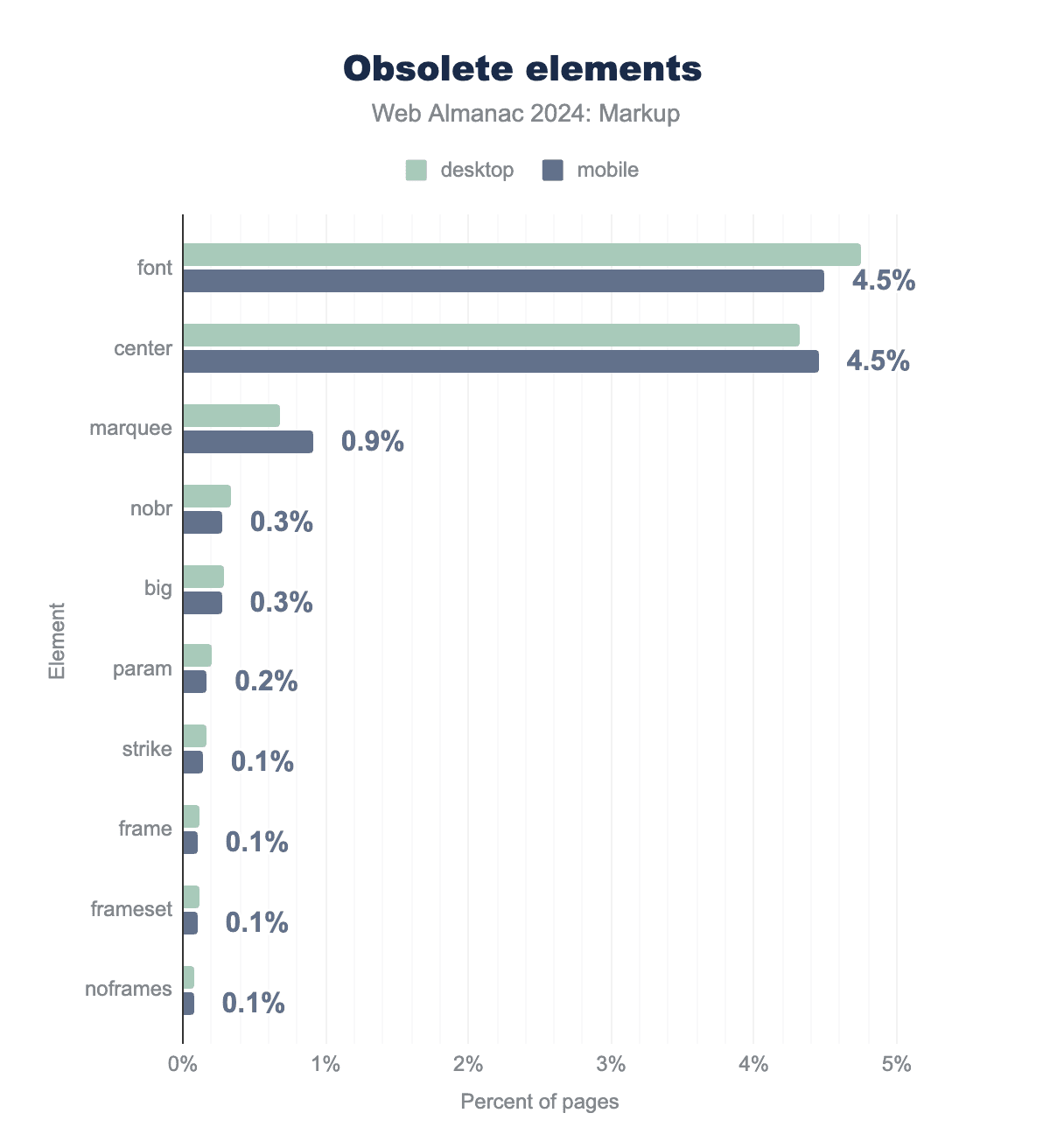HTML仕様によると、現在29の廃止・非推奨要素があります。そして、keygenを除くすべての要素が、今年のデータセットの一部(または多く)のページに出現しています。