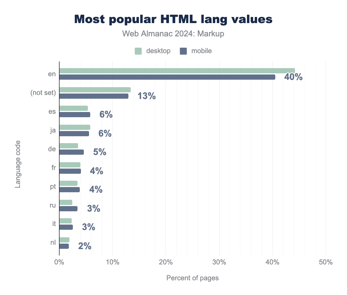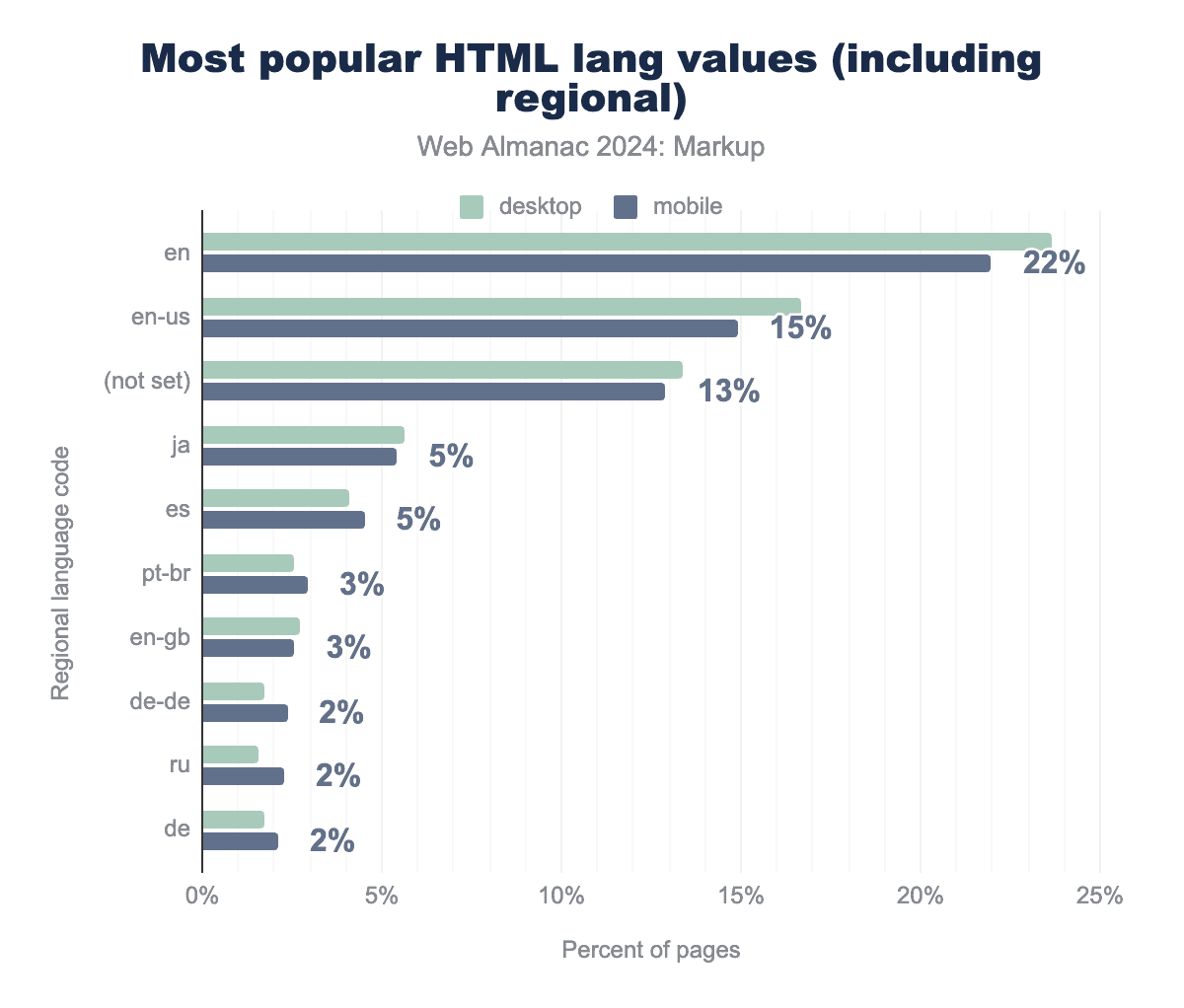 非英語および「未設定」以外のlang値のパーセンテージを集計すると、全ページの約46%を占めており、ウェブコンテンツの真のグローバル性を反映しています。ただし、上述のように、lang属性の誤設定が頻繁にあることを考えると、en値の高い割合が必ずしもコンテンツが英語であることを意味しないことを覚えておくことが重要です。