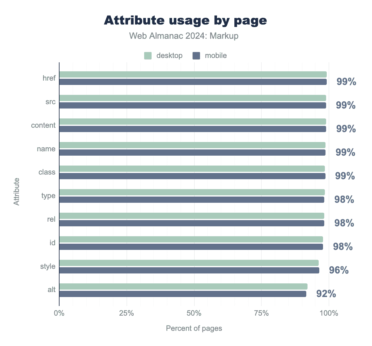 hrefがもっとも使用されており(モバイルページの99%で使用)、次いでsrc(モバイルで99%)、content(モバイルで99%)、name(モバイルで99%)、class(モバイルで99%)。残りのトップ10はtype、rel、id、style、altで、値は98%から92%の範囲です。