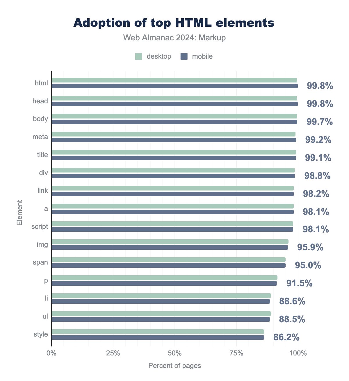 デスクトップとモバイルの両プラットフォームにおける上位HTML要素の採用率は一貫して高く、現代のウェブ開発における基盤的な役割を反映しています。<html>、<head>,と<body>要素はほぼ普遍的で、デスクトップとモバイルの両方のページの99.7%以上で使用されています。
